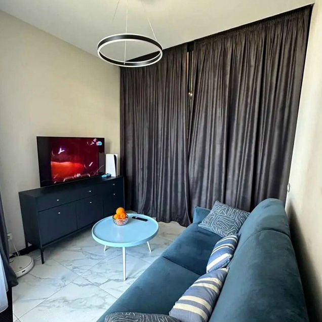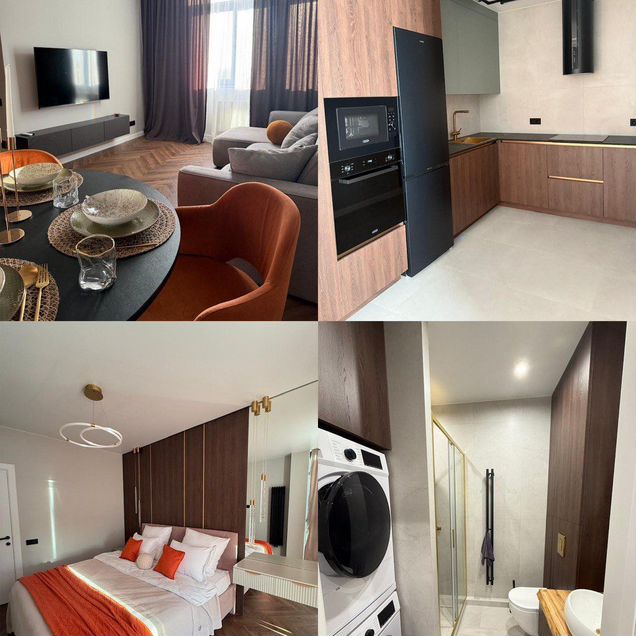 Гостиная совмещена с кухней и оборудована всем необходимым: современный кухонный гарнитур, встроенная техника (холодильник, электроплита, вытяжка, микроволновка), обеденный стол и стулья, и стиралка. В гостиной зоне — удобный диван, журнальный столик и стильные светильники, которые создают уютную атмосферу.