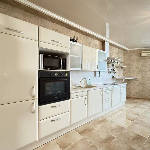 Квартира полностью оборудована мебелью и бытовой техникой: два кондиционера, два телевизора, посудомоечная и стиральная машинка, духовой шкаф, микроволновая печь.