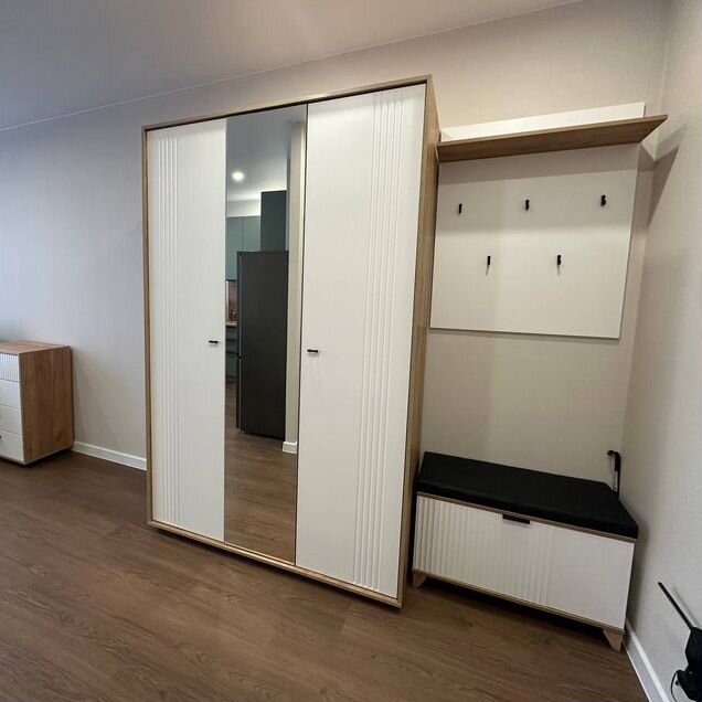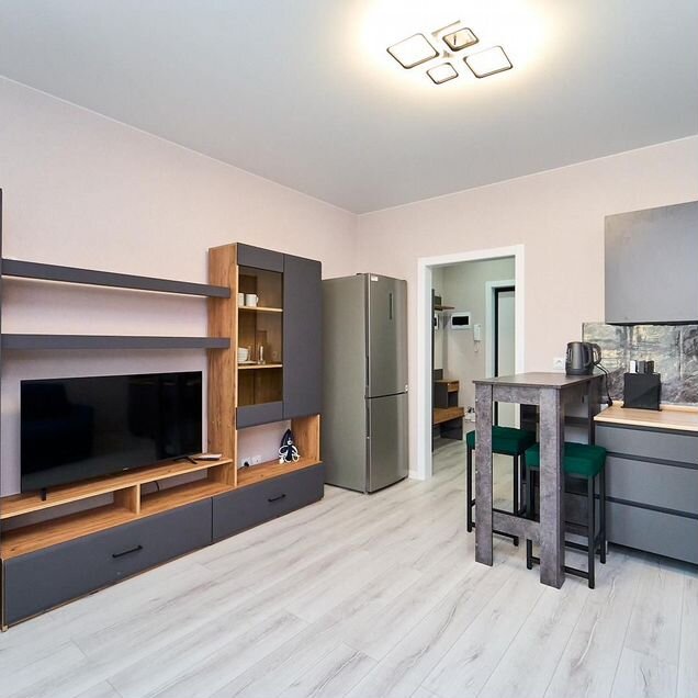 В квартире есть всё необходимое для комфортного проживания. В комнате и на кухне установлена современная мебель. Для удобства жильцов предусмотрена бытовая техника: кондиционер, холодильник, телевизор и стиральная машина. Ванная комната оборудована ванной. Студия отличается продуманной планировкой, что создаёт ощущение простора и уюта.