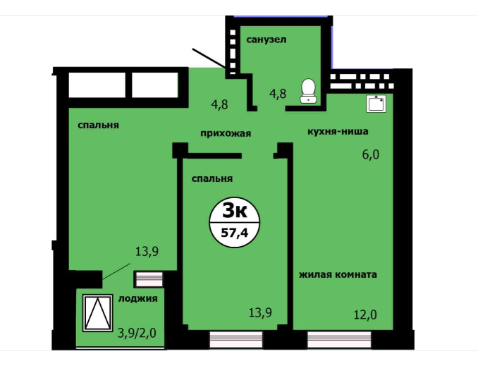 3-комн. кв., 55.7 м², 18/19 этаж