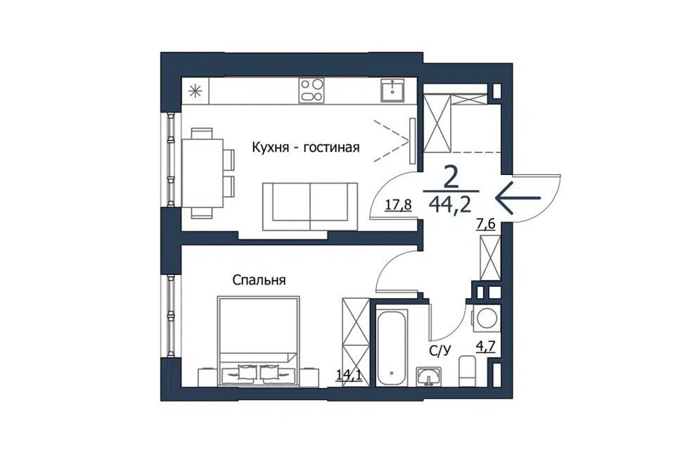 1-комн. кв., 44.7 м², 21/23 этаж