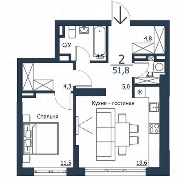 2-комн. кв., 51.8 м², 21/23 этаж