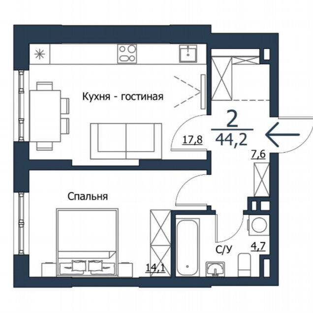 2-комн. кв., 44.2 м², 2/23 этаж