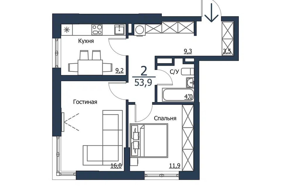 2-комн. кв., 53.5 м², 23/23 этаж