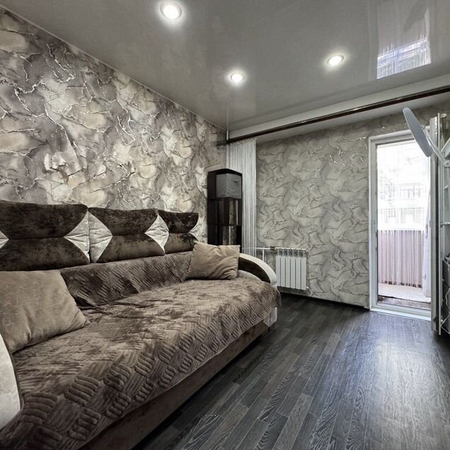 - В гостиной вытянуты и окрашены потолки с глянцевым оттенком.