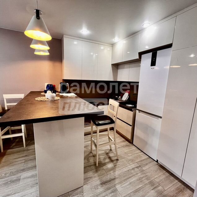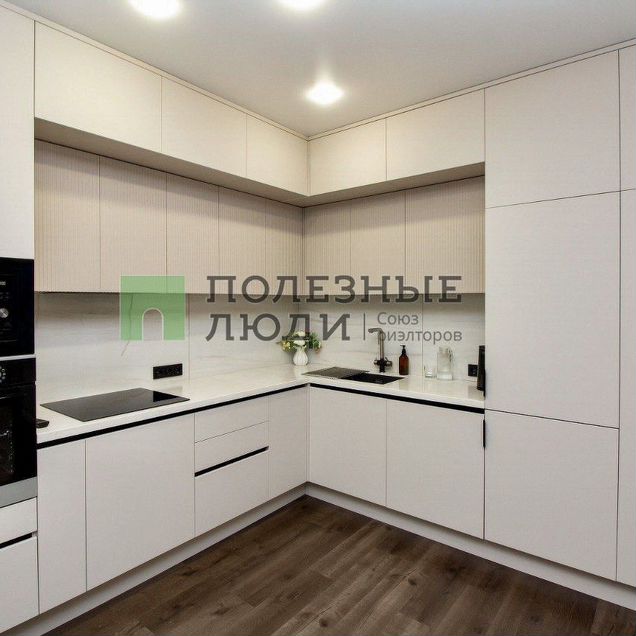 Корпусная мебель (кухонный гарнитур с фасадами из MDF и с фурнитурой премиального сегмента, сделан на заказ, входная группа и два шкафа-купе, вытяжка, варочная поверхность духовой шкаф ) остаются новому собственнику. В прихожей на полу керамогранит стены декоративная штукатурка.