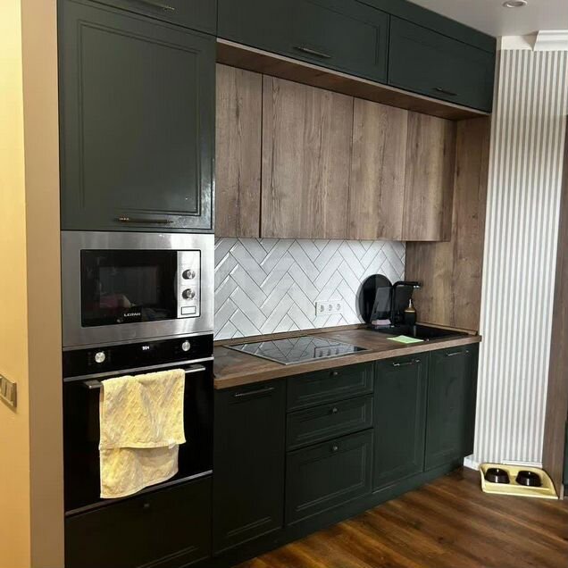 -Кухня сделана на заказ, установлена вытяжка и барная стойка изящно разделяющая кухонную и спальную зоны.