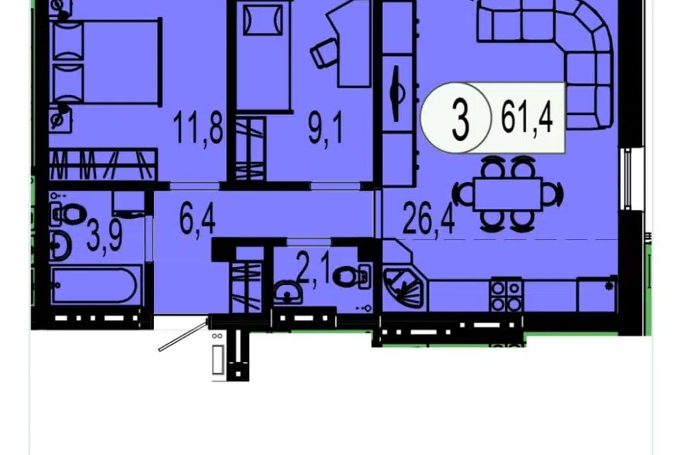 3-комн. кв., 62.1 м², 6/9 этаж