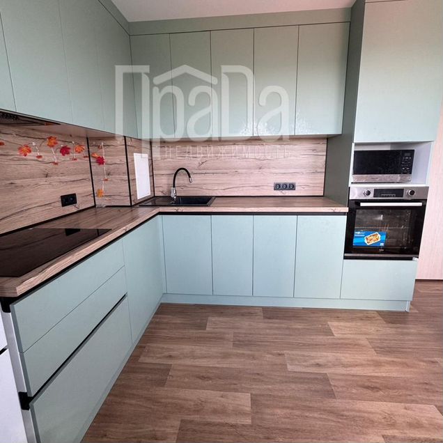 - Кухонный гарнитур со встроенной бытовой техникой (варочная поверхность, духовой шкаф, посудомоечная машина, вытяжка, микроволновка, холодильник).