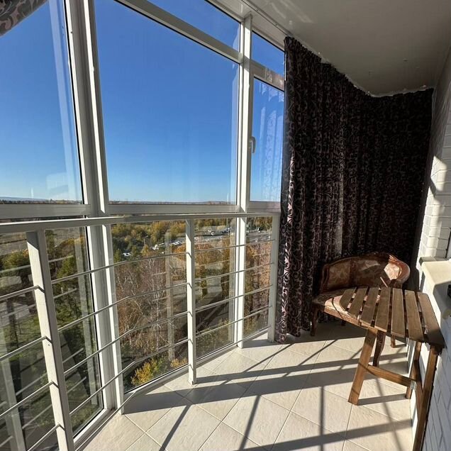 Балкон-лоджия открывает прекрасный вид на лесной массив — отличное место для утреннего кофе или вечернего релакса.