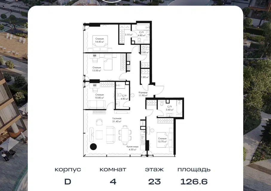 4-комн. кв., 126.6 м², 23/39 этаж