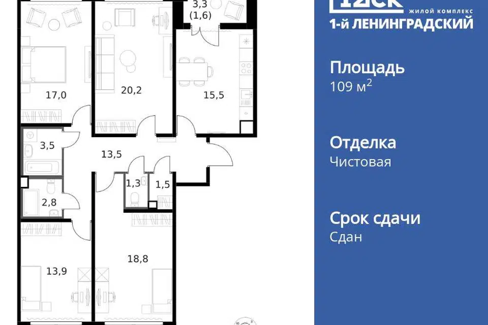 4-комн. кв., 108.9 м², 3/6 этаж