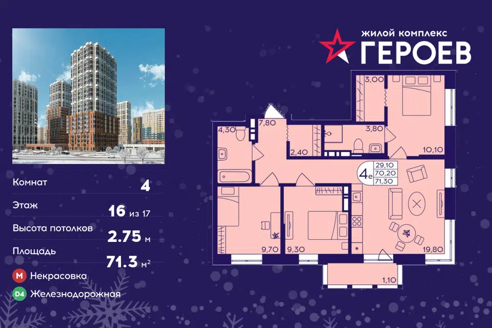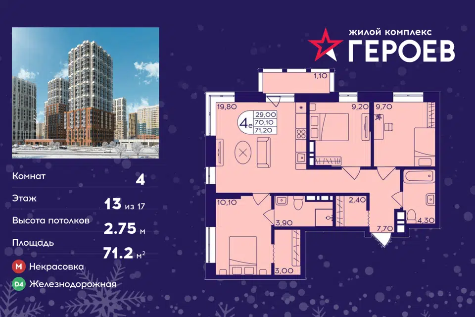 4-комн. кв., от 70.4 м², 4-13 этажи