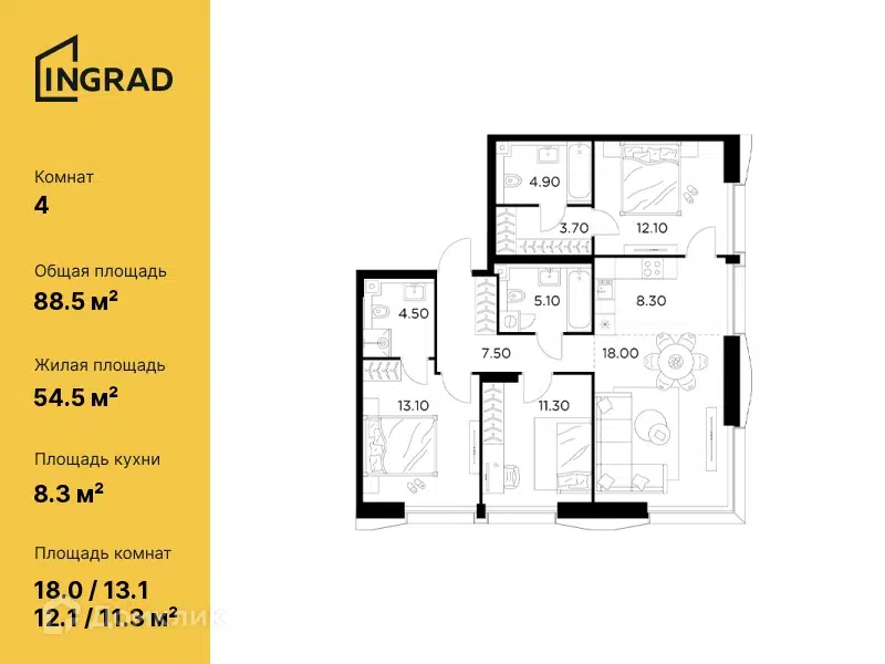 4-комн. кв., 128.8 м², 4/9 этаж