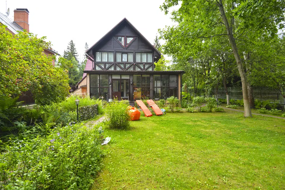 На территории участка в собственности с разноуровневым ландшафтом организованы: детская игровая площадка с качелями, крытый настольный теннис, зона барбекю и застекленная веранда.