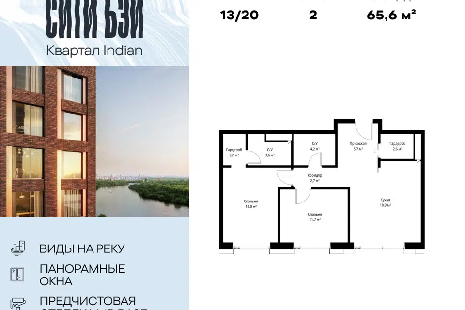 2-комн. кв., 65.6 м², 13/20 этаж