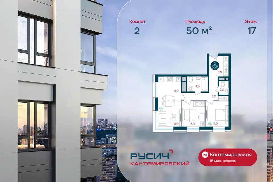2-комн. кв., 50 м², 2/32 этаж