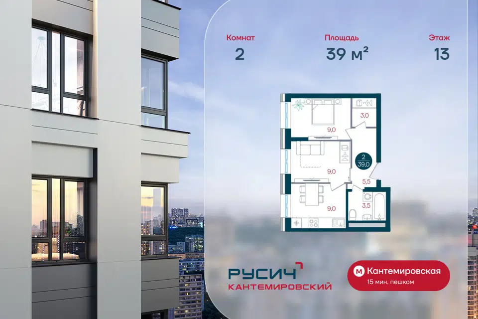 2-комн. кв., 39 м², 13/32 этаж