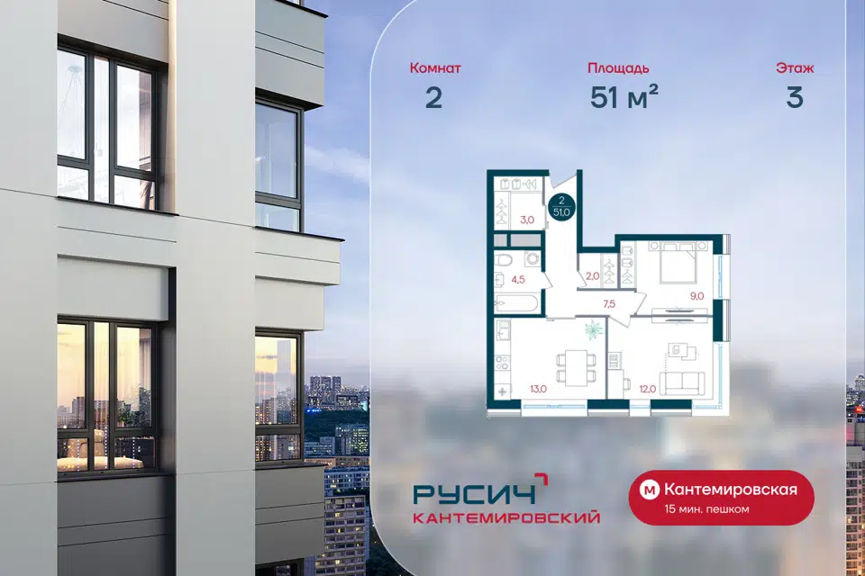 2-комн. кв., 51 м², 3/32 этаж