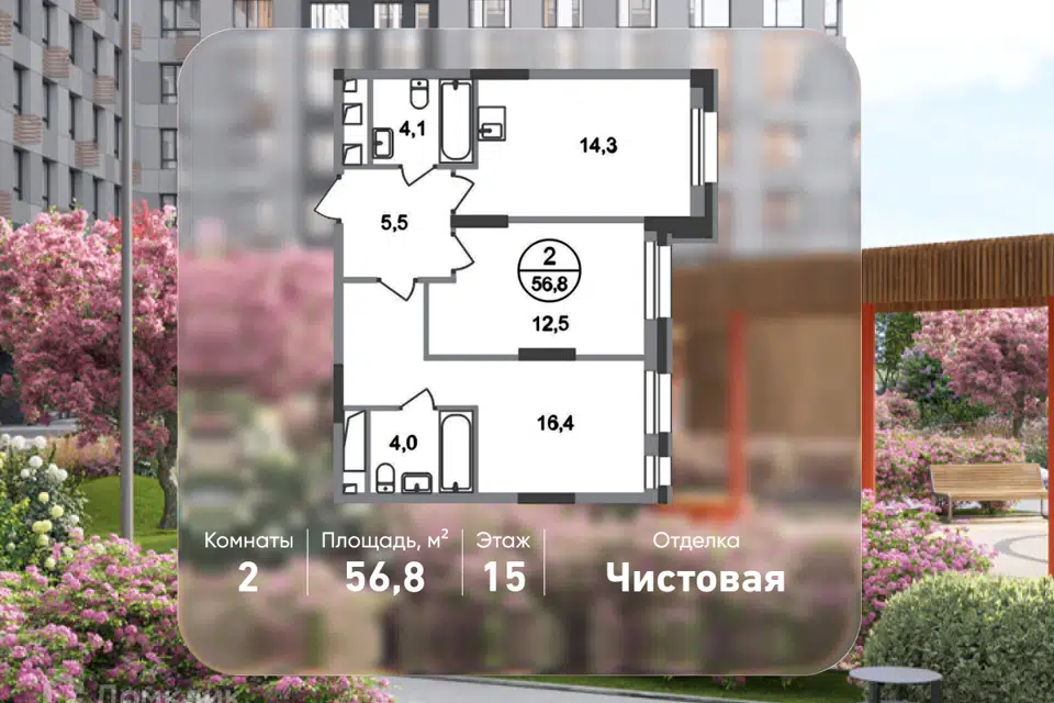 2-комн. кв., 56.8 м², 15/20 этаж