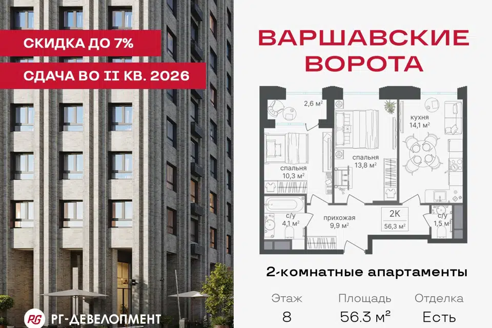 2-комн. кв., 56.3 м², 8/30 этаж