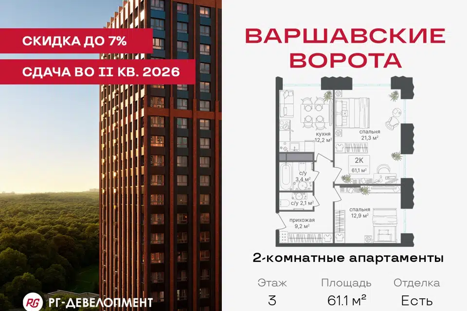 2-комн. кв., 61.1 м², 3/30 этаж