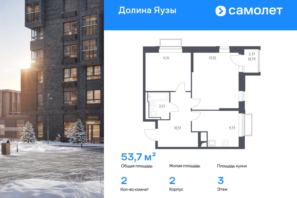 2-комн. кв., 53.7 м², 3/24 этаж