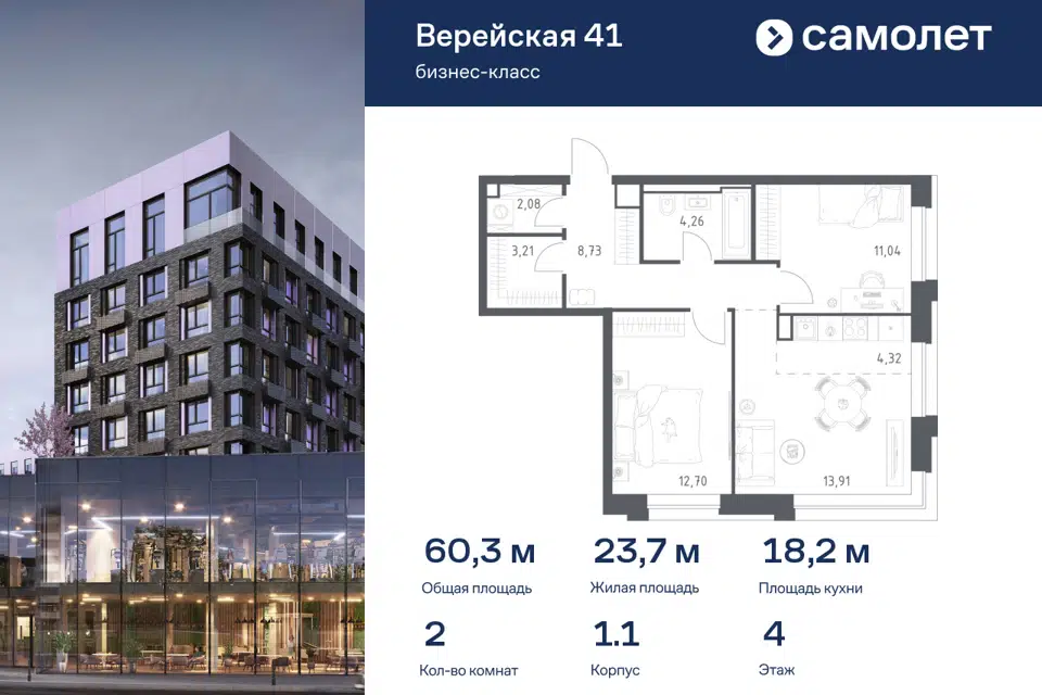 2-комн. кв., от 60.7 м², 2-9 этажи
