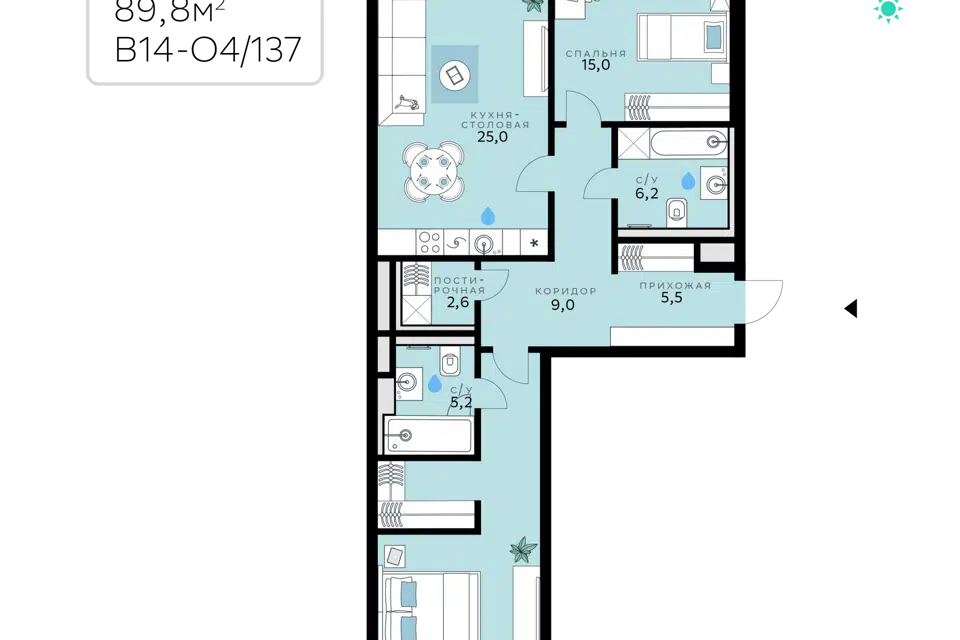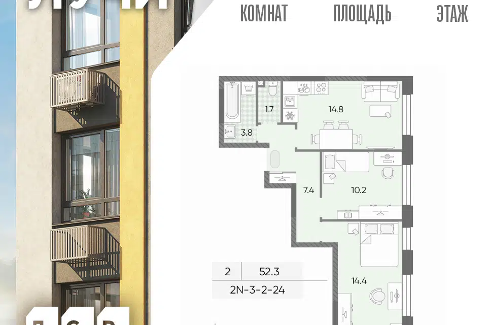 2-комн. кв., 52.3 м², 4/25 этаж