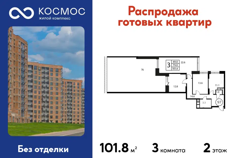 3-комн. кв., 101.8 м², 2/12 этаж