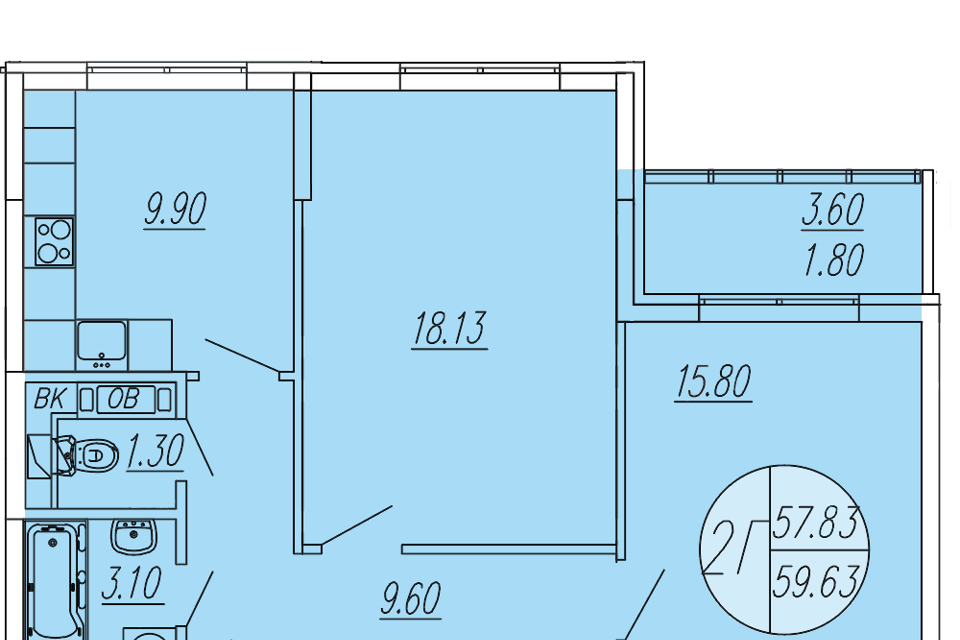 2-комн. кв., 59.63 м², 1/4 этаж