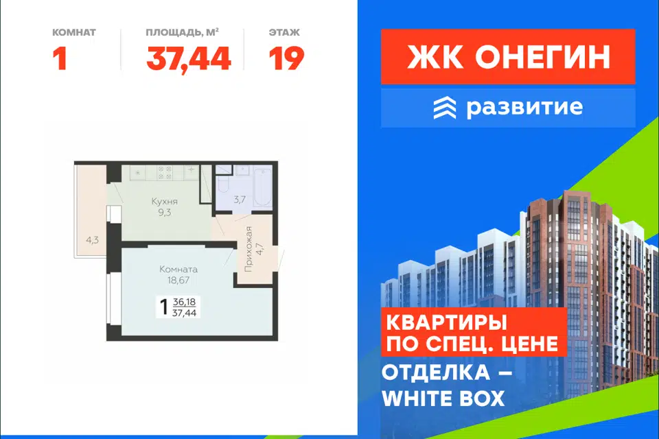 1-комн. кв., 37.44 м², 19/22 этаж