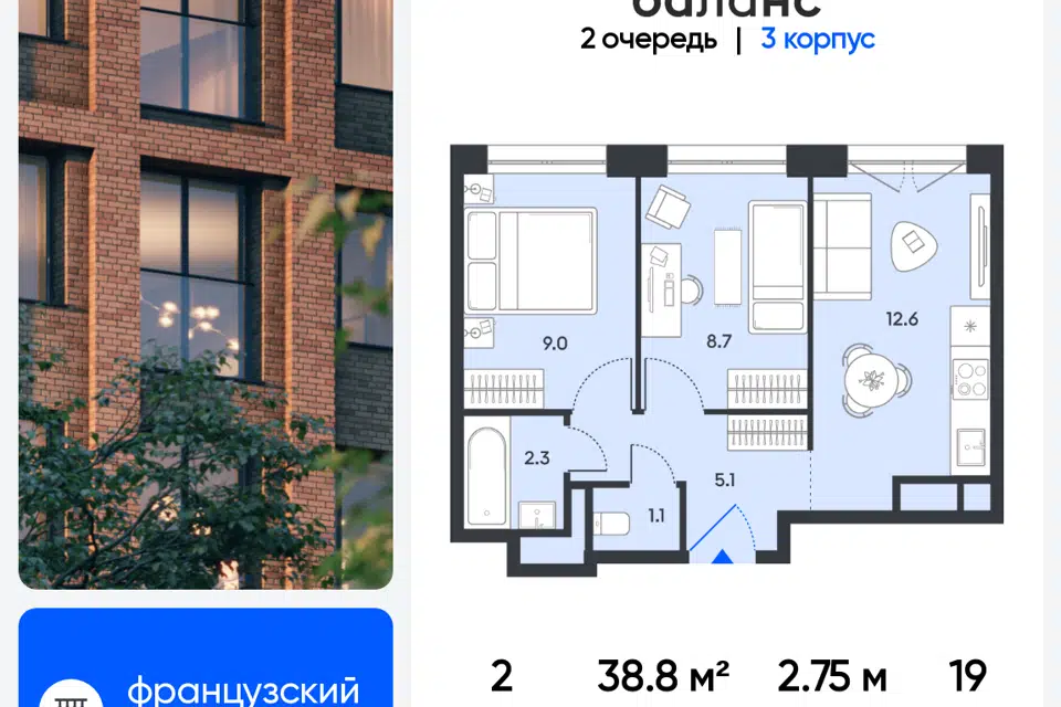 2-комн. кв., 38.8 м², 19/10 этаж