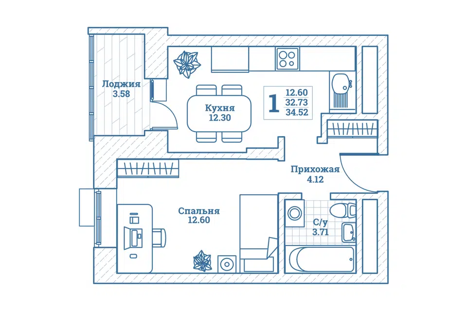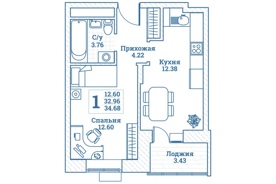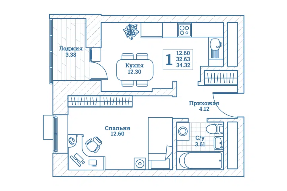 1-комн. кв., 32.9 м², 3/7 этаж