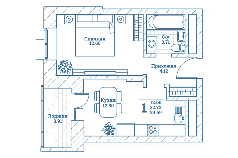 1-комн. кв., 34.68 м², 2/7 этаж