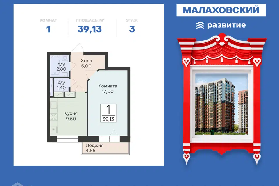 1-комн. кв., 39.13 м², 3/17 этаж