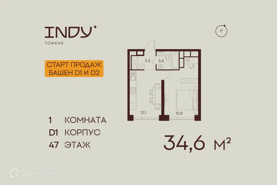 1-комн. кв., 34.6 м², 42/55 этаж