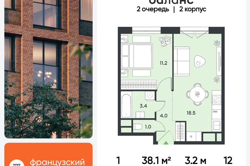 1-комн. кв., 38.1 м², 12/12 этаж