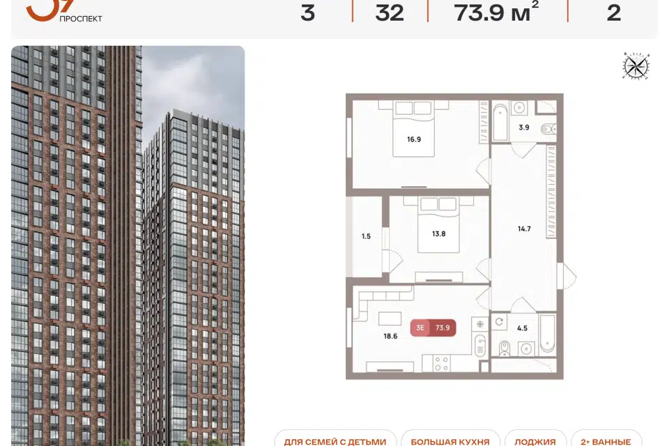 3-комн. кв., 73.9 м², 32/32 этаж
