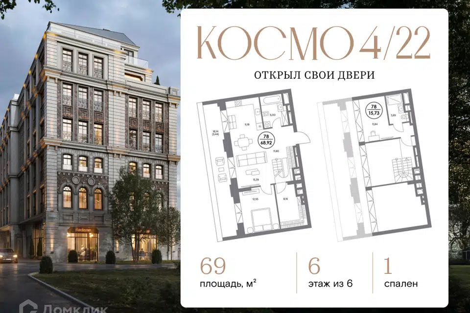 1-комн. кв., 69 м², 6/6 этаж