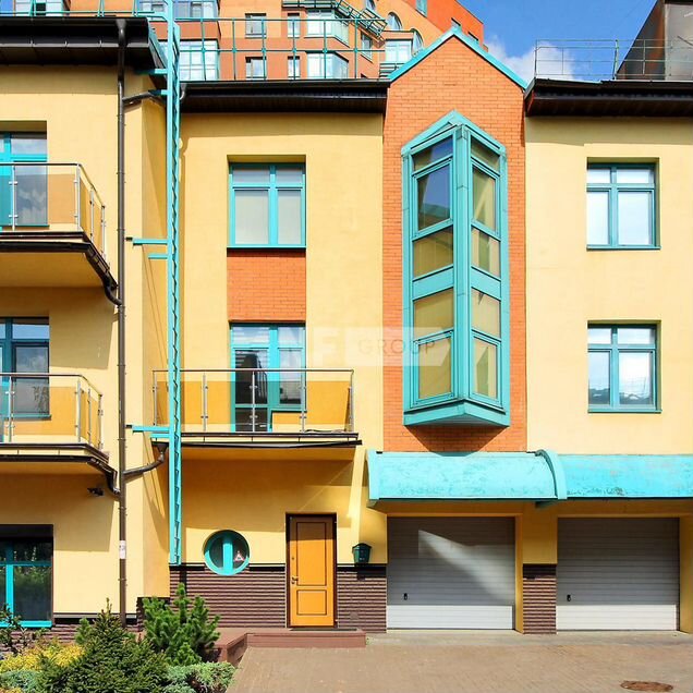 Внутреннее пространство включает 3 уровня, а также цокольный этаж и подвал. Планировка: гостиная с зоной кухни, 4 спальни, 3 с/у, помещения для размещения тренажерного зала, кладовых, гардеробных. Есть просторные балконы.