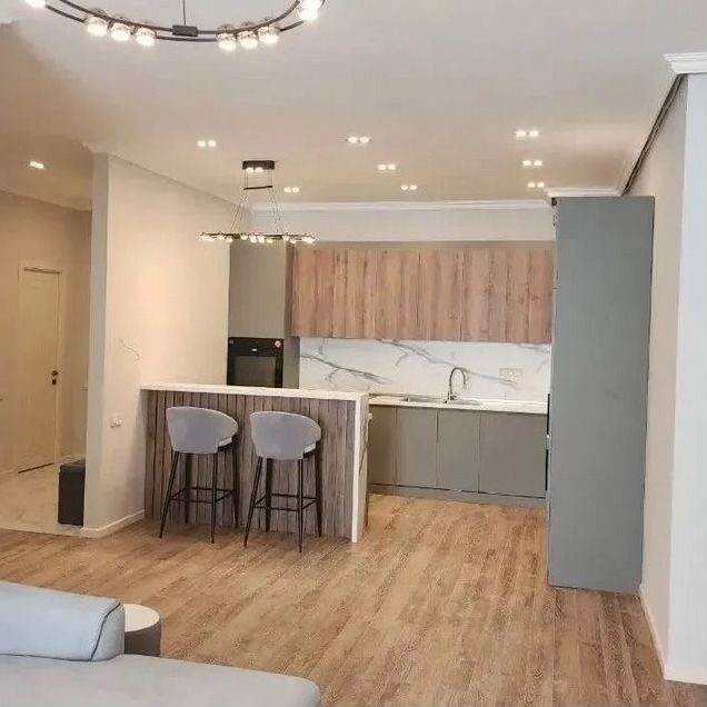 Выполнена отделка в современном стиле с применением натуральных материалов, квартира меблирована и оснащена качественной бытовой техникой.
