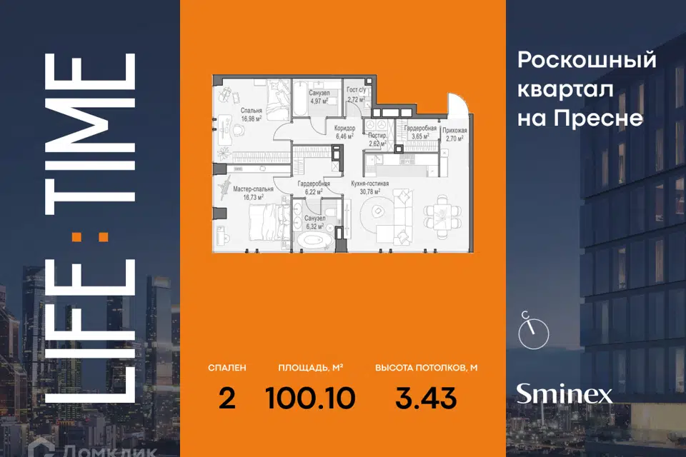 2-комн. кв., 100 м², 13/78 этаж