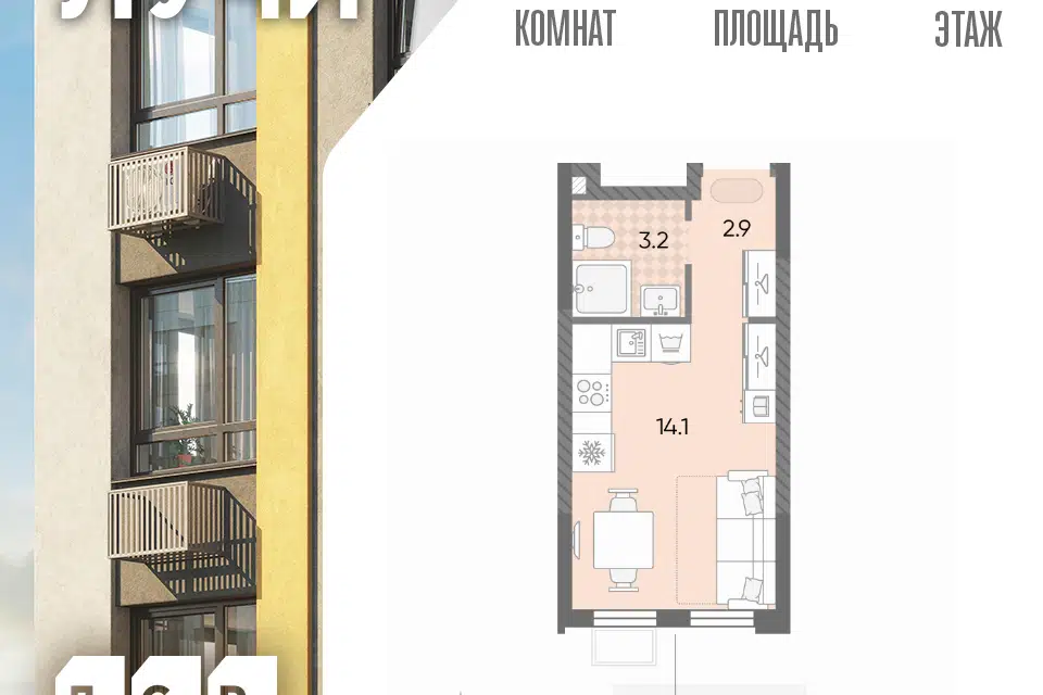 Студия, 20.67 м², 9/15 этаж