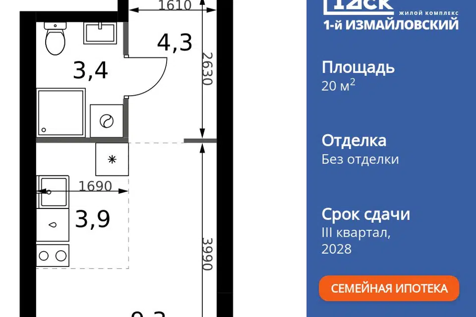 Студия, 20.3 м², 2/43 этаж