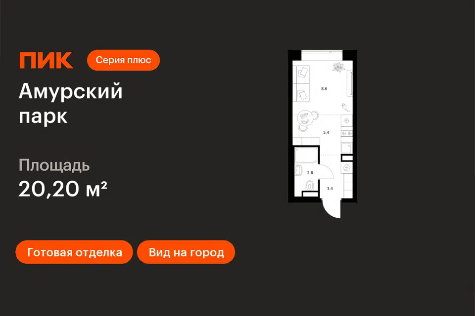 Студия, 20 м², 11/28 этаж