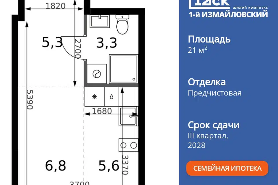 Студия, 20 м², 33/39 этаж