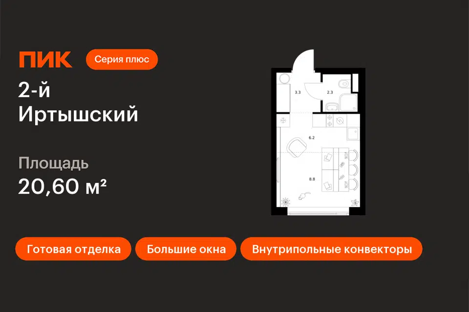 Студия, 20.9 м², 2/32 этаж