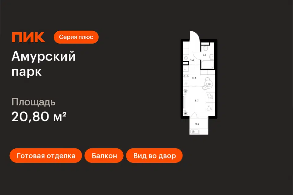 Студия, 20.8 м², 9/27 этаж