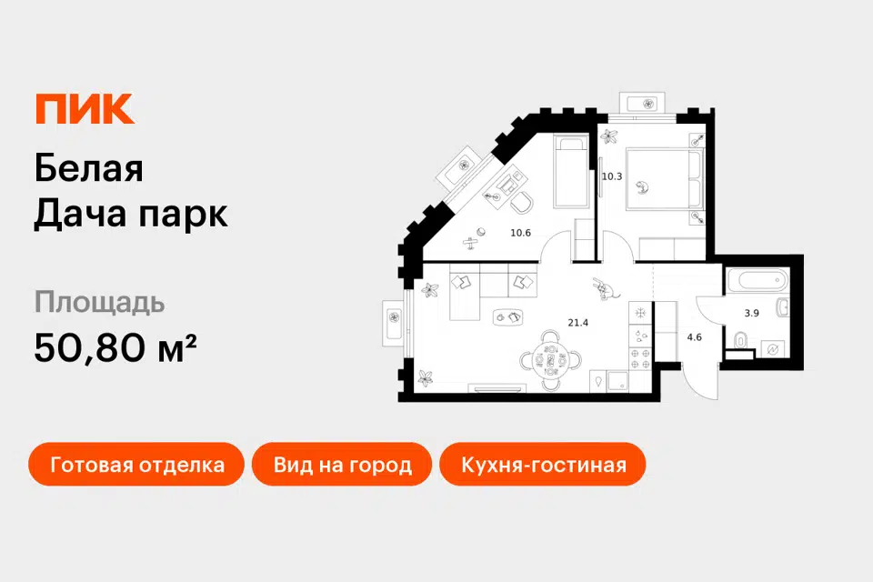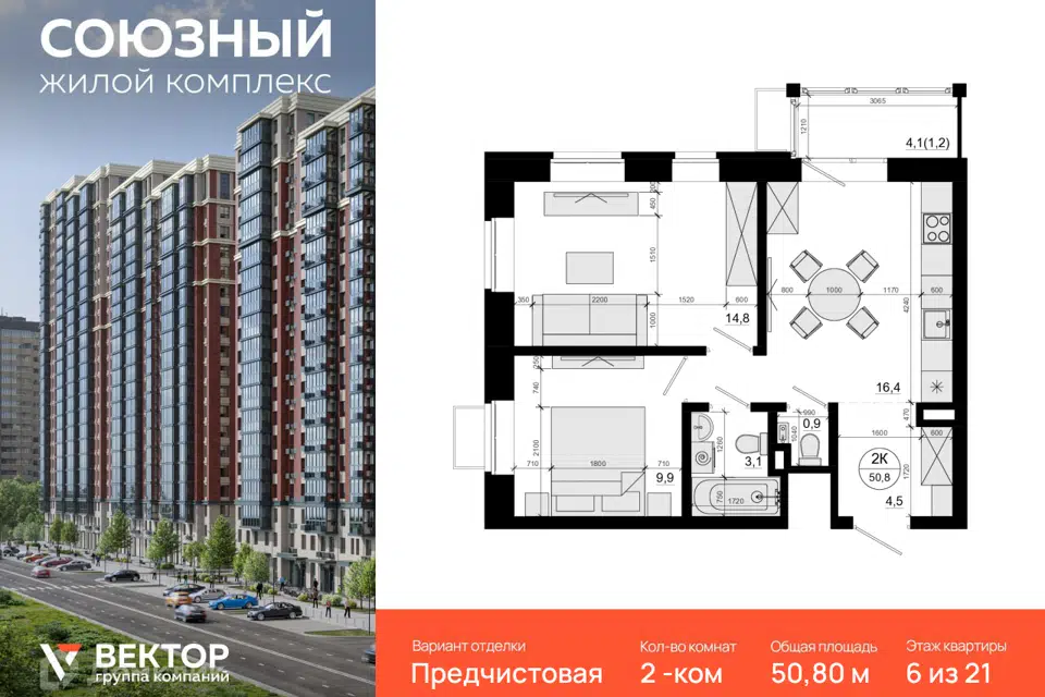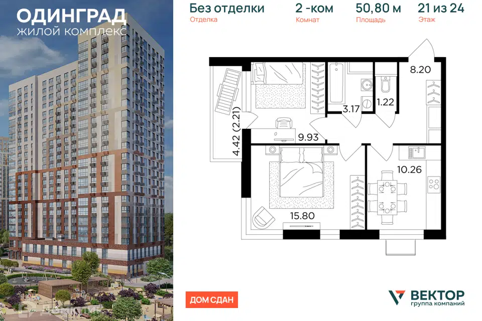 2-комн. кв., 50.8 м², 21/24 этаж